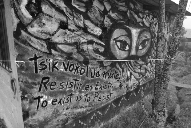 Years later in Zapatista territory with Palestinian compas returning from the Little School we noticed a similar mural on a building in Oventik, in Maya Tzotzil lands. It read “To exist is to resist” in four languages: Tzotzil, Spanish, English, and Italian along with “¡De chiapas a palestina la lucha por la libertad nos hermanece!” from Chiapas to Palestine, the struggle for freedom makes us kin! (January 1, 2014)