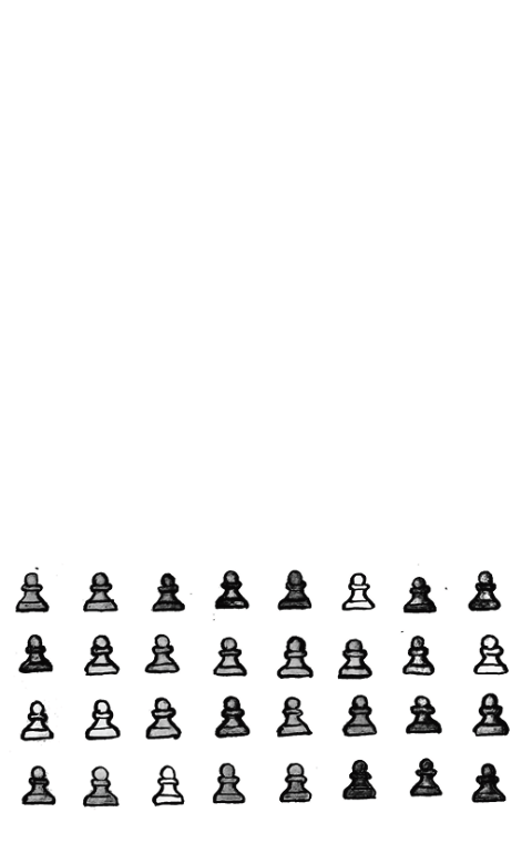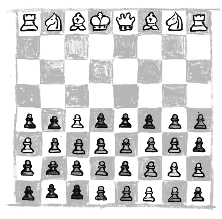 Sometime later, I came across an illustration from a series La Vida en el Ajedrez, Life in Chess. It showed four rows of Pawns against one row of Pieces with no Pawns protecting any of the Pieces. The artist, Eduardo Salles, had entitled the illustration Revolución, Revolution. I wondered the backstory: how had the Pawns recruited more Pawns to become 32? Had the other side’s Pawns been convinced to switch sides?