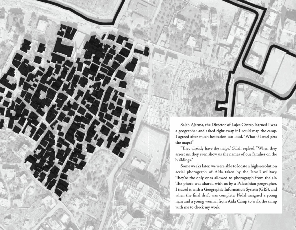 Some weeks later, we were able to locate a high-resolution aerial photograph of Aida taken by the Israeli military. They’re the only ones allowed to photograph from the air. The photo was shared with us by a Palestinian geographer. I traced it with a Geographic Information System (GIS), and when the final draft was complete, Nidal assigned a young man and a young woman from Aida Camp to walk the camp with me to check my work.