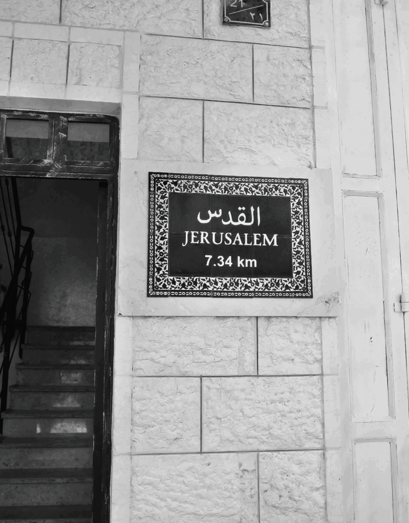 Outside of Lajee Center in Aida Camp exists a ceramic sign that announces al-Quds, Jerusalem, is only 7.34 kilometers away, a distance less than 5 miles. The sign is correct if we assume smooth space: no checkpoints, no walls, no borders, no violence. Nidal remembers when he and his friends could walk from Aida Camp to al-Quds in the evenings to eat ka‘ak, a sesame-covered ring-shaped bread, and could walk back to the Camp still in time for bed.