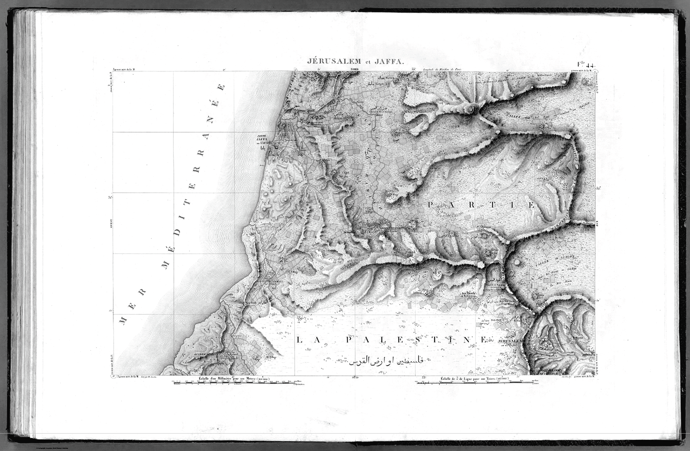 Below are Sheet 43, Gaza and Sheet 44, Jerusalem and Jaffa. While the coast is mapped relatively accurate, the French expedition did not survey Jerusalem but included it for its great significance to readers of the encyclopedia.