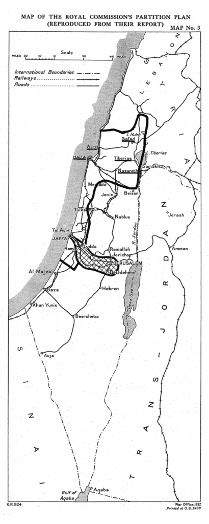 The Peel Commission proposed a partition of Palestine in 1937 allotting the surveyed lands to a future Jewish State and adding an international corridor to maintain European access to Jerusalem from the Mediterranean at Jaffa, with “international” meaning European.